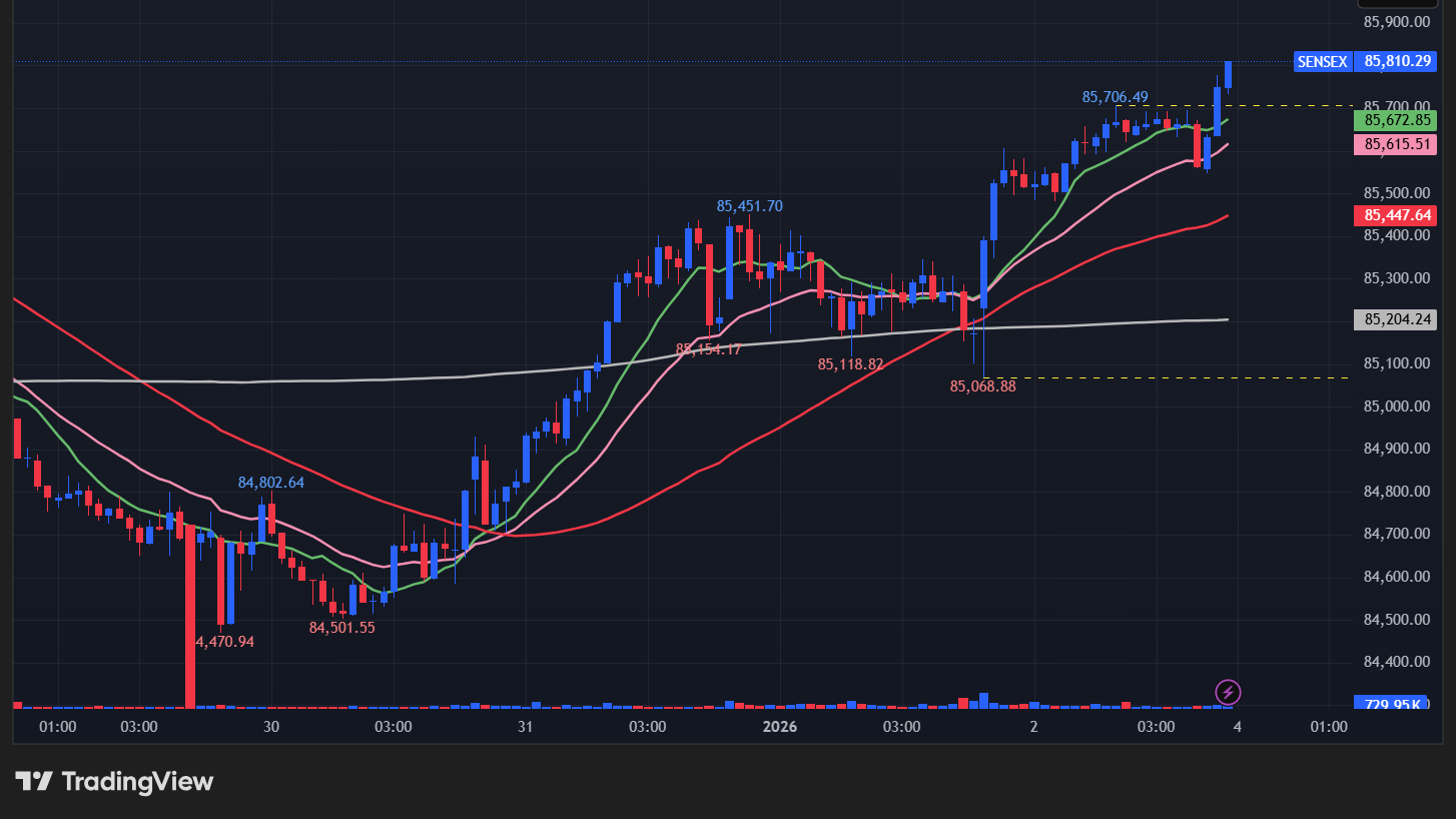 年初取引でセンセックスは0.67%高の85,762と過去最高値を更新しました。発電、銀行、自動車、金属株を中心に幅広い買いが入り、第3四半期決算への期待と安定した国内マクロ環境が投資心理を改善させました。NTPCやSBI、Bajaj Financeなどが上昇する一方、たばこ増税懸念からITCが急落し、FMCGセクターは軟調でした。週間では指数は約0.8%上昇しました。