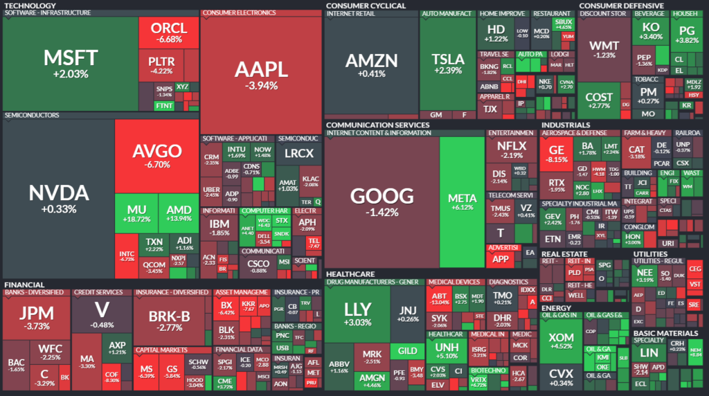 S&P500は1.9%安、ダウは1.7%安、ナスダックは1.9%安となりました。トランプ大統領が欧州8カ国に対し関税(2月に10%、6月に最大25%)を示唆し、貿易リスクが急浮上しました。加えてデンマーク年金基金の米国債縮小観測で国債利回りが急上昇し、成長株に逆風となりました。NVIDIA、ブロードコム、オラクルなど半導体・大型テックが急落。3Mは弱い見通しで7%安、Netflixも買収観測で小幅安。