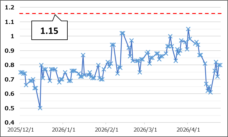 ↑先週とは異なり上昇に転じて0.8をこえました。